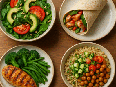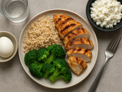 • 12:00 — posiłek główny: źródło białka (ryba, drób, roślinne), warzywa, złożone węglowodany;