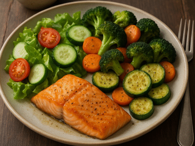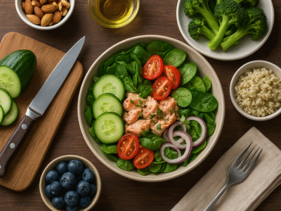 - Sałatka z ciecierzycy, pieczonych warzyw i jogurtowego dressingu — szybka, sycąca i bogata w białko i błonnik.